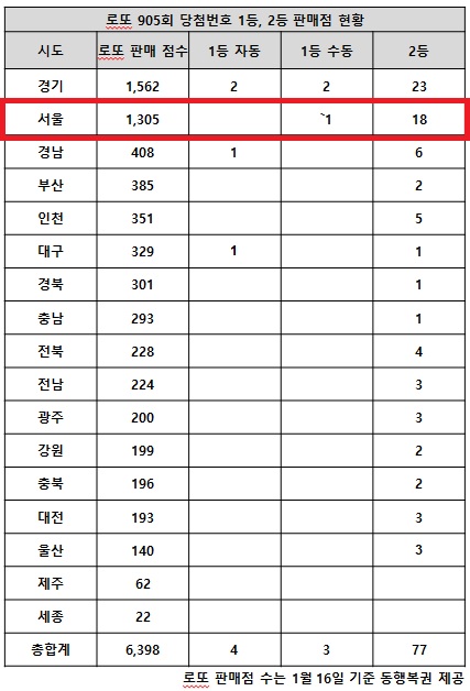 4일 동행복권이 추첨한 로또 905회 당첨번호 조회 결과 1등은 7명, 2등은 77명이다. 전국의 로또복권 판매점 17개 시도별 중 경기 지역 다음으로 판매점이 많은 서울에서는 자동 없이 수동으로 1곳 만 1등 당첨자가 나왔다.로또 905회 당첨번호 1등 30억·2등 4572만 원[더팩트│성강현 기자] 사실상 서울은 없다?