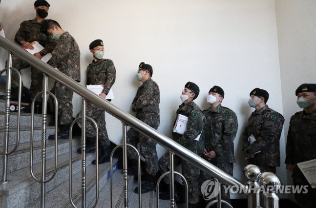 (춘천=연합뉴스) 양지웅 기자 = 제21대 총선 사전투표가 시작된 10일 오전 강원 춘천시 신사우도서관에 마련된 사전투표소에서 군인들이 소중한 표를 행사하고자 줄지어 서 있다. 2020.4.10