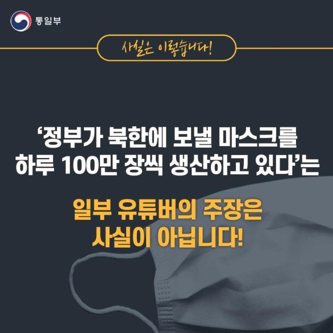 통일부는 "해당 주장은 사실이 아니다"라며 "이번 코로나19와 관련해 정부 차원에서 마스크 대북 지원이 검토된 바 없으며 국내 민간단체에서 마스크 대북 지원을 위해 반출 신청을 한 사례도 없다"고 밝혔다.