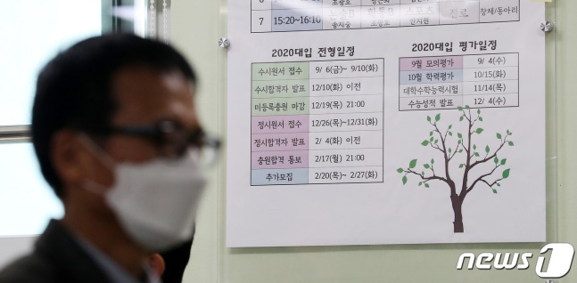 (서울=뉴스1) 박지혜 기자 = 9일 오전 서울 성동구 도선고등학교 3학년 7반 교실에 온라인 개학식을 하는 교사 뒤로 지난 대입일정이 붙어 있다.