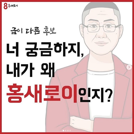 홍 후보는 "너 궁금하지, 내가 왜 홍새로이인지?”라는 문구와 함께, 홍 후보의 얼굴에 ‘이태원 클라쓰’ 박새로이 특유의 헤어스타일을 한 캐릭터를 내세웠다.