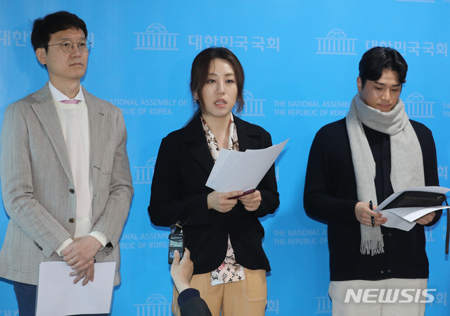 미래통합당 조성은(가운데) 선대위부위원장, 정원석 선대위 상근대변인, 김웅(왼쪽) 송파갑 후보자가 5일 서울 여의도 국회 소통관에서 N번방 사건TF대책위원회 브리핑을 하고 있다. /사진 = 뉴시스미래통합당은 전날 국회에서 기자회견을 열고 "우리 당 인사가 (n번방 사건과) 유사한 성범죄와 연루될 경우 정계에서 퇴출할 것을 천명한다"는 성명을 냈다. 통합당 중앙선대위 정원석 대변인은 "통합당은 성범죄 사건과 전면전을 선포한다"고 강조했다.